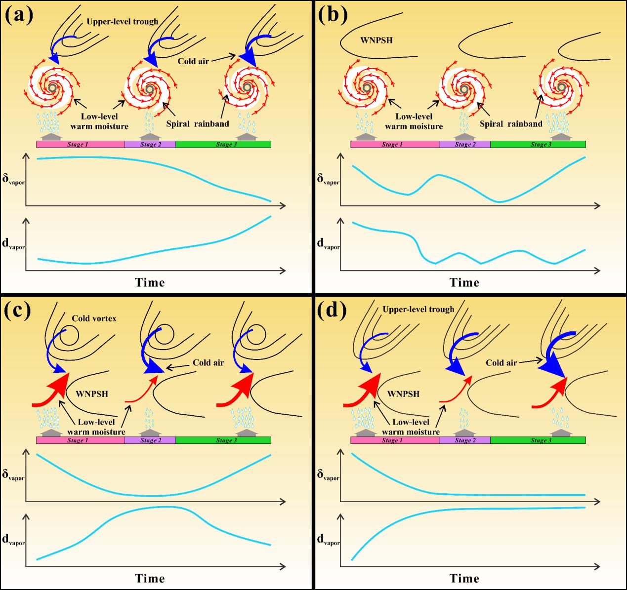 针对这一问题,庞洪喜教授课题组基于南京大学地球系统区域过程综合观测试验基地(SORPES)长时间连续高分辨率水汽稳定同位素观测资料,结合地面气象观测、卫星观测资料、再分析资料等,系统分析了东亚地区暴雨过程中水汽同位素变化特征及其揭示的暴雨形成机制。研究发现,在不同天气系统的影响下,水汽稳定同位素值呈4种变化模式,包括缓慢下降型(台风与中高纬度系统相互作用,图1a)、W型(台风本体,图1b)、U型(冷涡,图1c)和L型(高空槽,图1d)。通过分析稳定同位素演化特征(图1)、后向轨迹模拟结果(图2)及瑞利分馏模型计算结果(图3),发现中国东部的暴雨事件主要由邻近海洋(包括南海和东海)和陆地环境的水汽维持,印度洋远源水汽的贡献相对较弱。基于稳定同位素演化特征(图4)、850hPa风场和相当黑体温度(图5)的综合分析,发现暴雨过程的间歇期对应了低层天气系统强度变化或整体转换导致的近海水汽输送改变。此外,本研究首次提出,分析大气水汽同位素水线斜率的变化可为暴雨事件预报提供前兆信号(图6)。上述认识对于深入理解东亚地区暴雨事件发生机理具有重要意义,为使用水汽稳定同位素示踪东亚暴雨过程提供了基准。